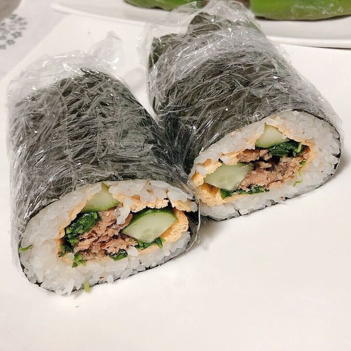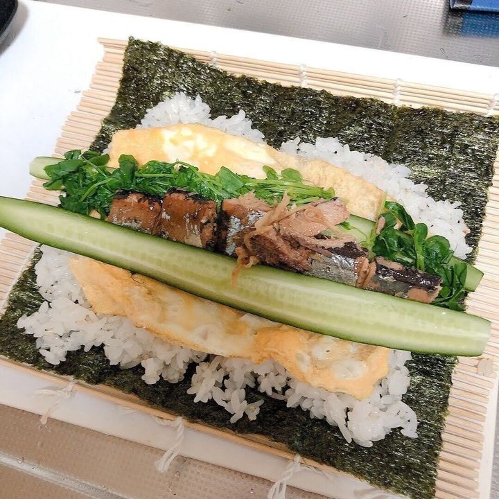 海苔の上に酢飯、卵、きゅうり、家にあった豆苗も入れて、サンマをほぐして乗せて、巻くだけで完成です。