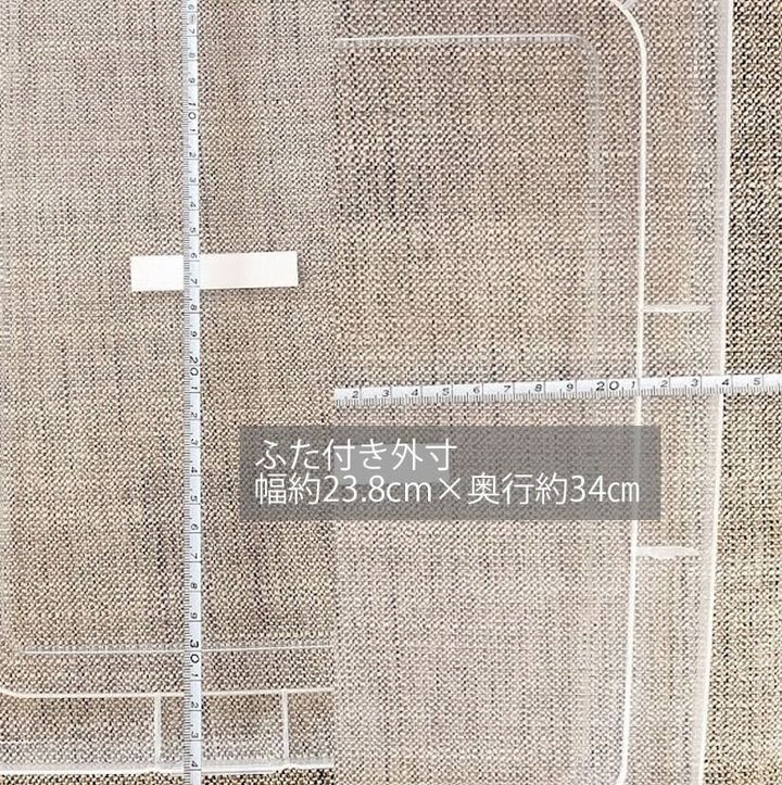 内寸は幅21.5cm×奥行き32cm×高さ12.3cmですが、ふたをつけた状態での外寸の幅は約23.8㎝、奥行きは約34㎝。