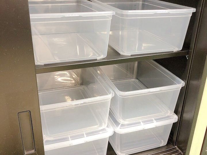 ご家庭ではこんなに大量にはならないでしょうけれど、棚の中にこまごましたものを収納したいときはケースを使うとぐちゃぐちゃになりません。