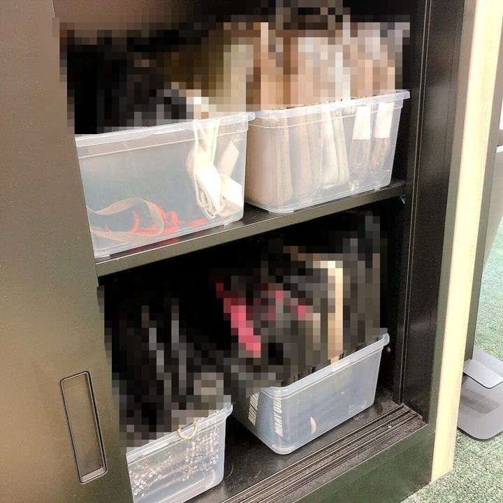 お客様(オフィス)での収納なので、具体的なモノはモザイクかけていますが、バッグ収納をしています。