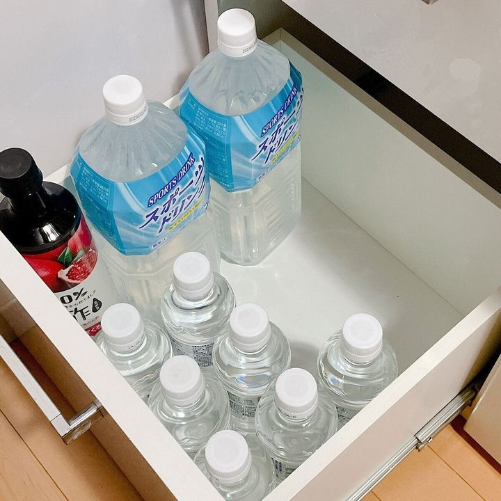 2Lのお水は非常用として用意していますが、500mlはローリングストックです。
