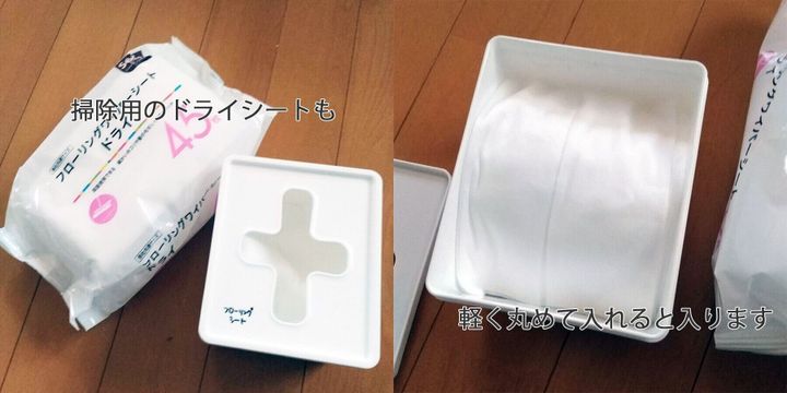 古い写真しかありませんでしたが、フローリングモップ用のドライシートも水切りネットと同様に軽く丸めて詰め替え。