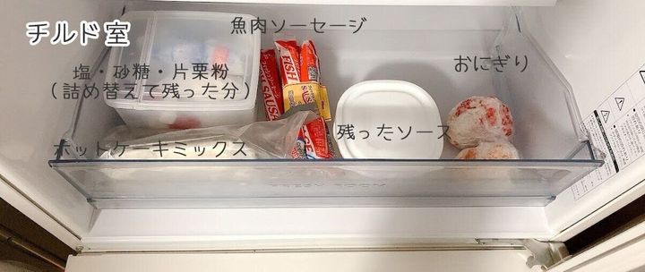 チルド室は普通はお肉や魚などを入れる場所ですが、我が家では冷凍しているのでここには別のものが。