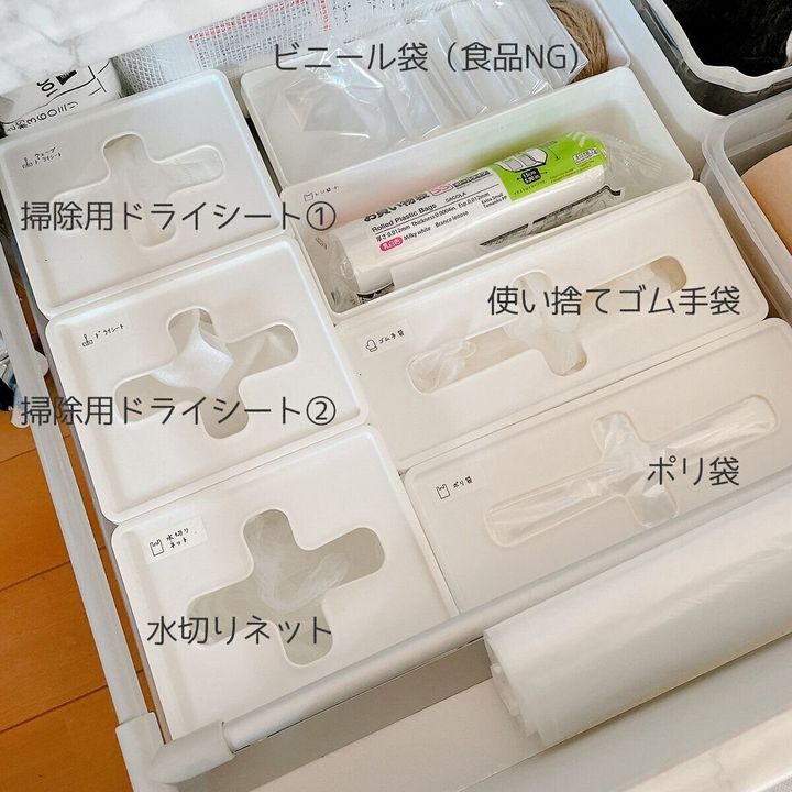 袋だけでなく、水切りネットやフローリングモップ用のシートもこのボックスに詰め替えていて、とても便利!