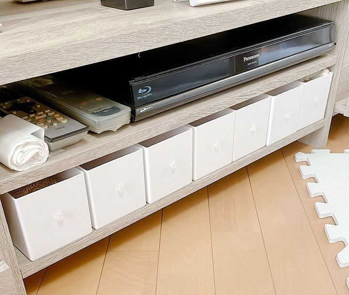 両サイドに引き出し、真ん中は棚の収納になっていて、上段はレコーダーを置き、下段にダイソーのケースを並べました。(取っ手はレジンで作ってつけています)