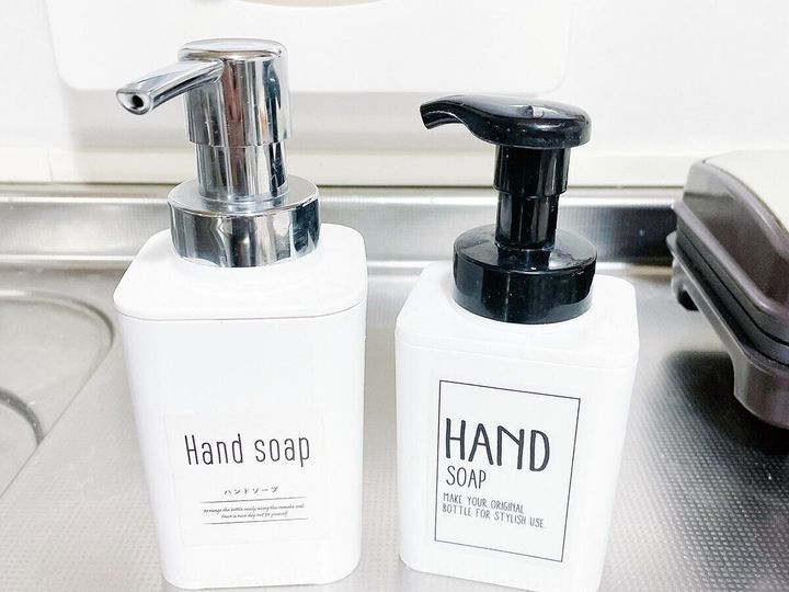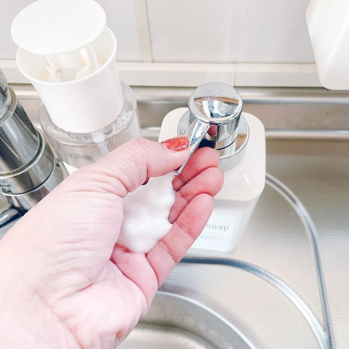 スマホを手に持って撮影したので写真では片手ですが、普段は右手でポンプを押して左手にハンドソープを出しています。