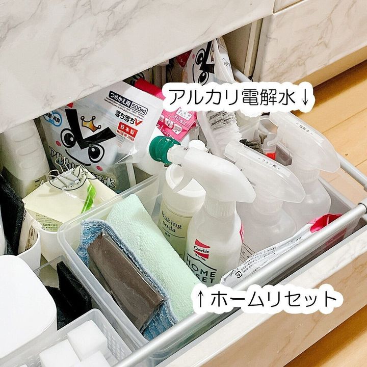 シンク下の引き出しに掃除用品をまとめているので、そこに洗剤も一緒に収納しています。