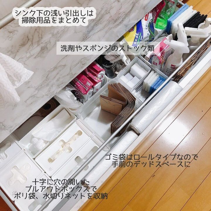 こちらもシンク下。下段の浅い引出しには袋類や洗剤を収納しています。