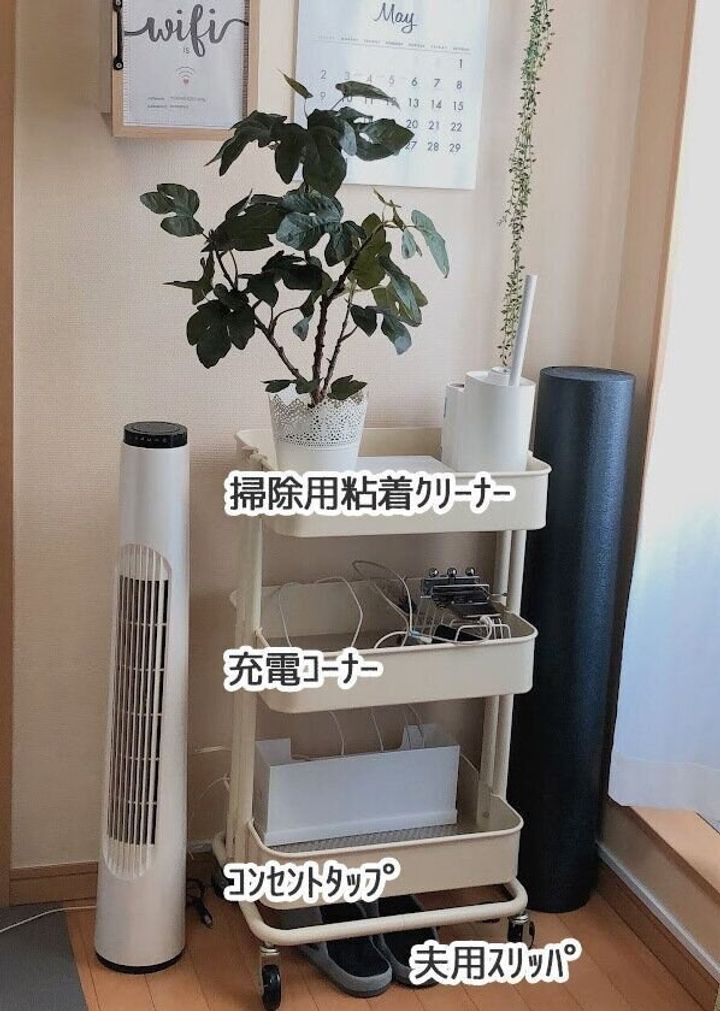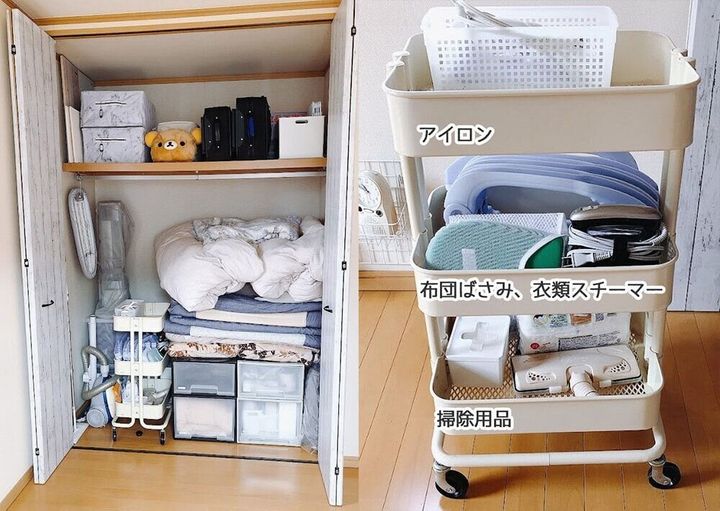そこにワゴンを置いて、アイロン(アイロン台はハンガーにかけています)、布団ばさみ、フローリング掃除用のシートなどを収納しています。