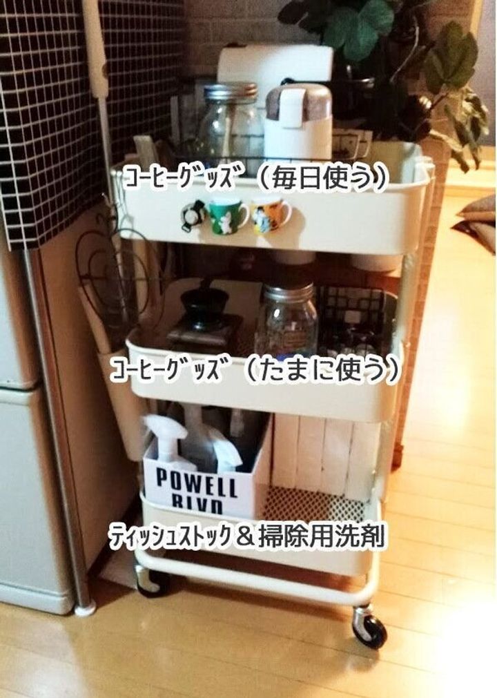 この当時は冷蔵庫横に置いて、キッチン周りで使うものなどを収納していました。