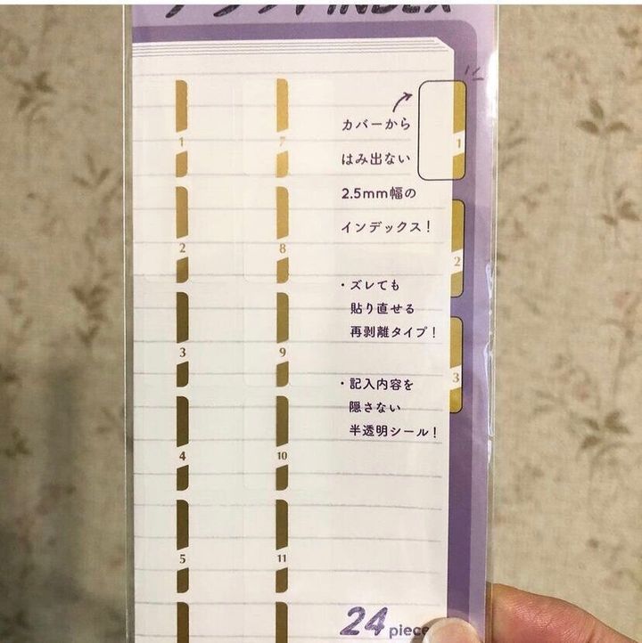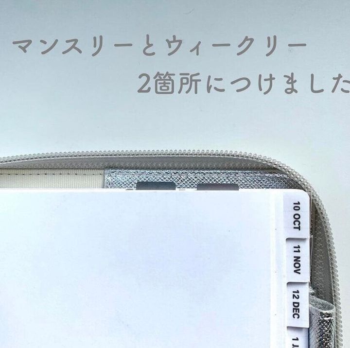手帳がマンスリーインデックスタイプでない場合、見たい月がさっと開けないですよね・・・。そんなときに、使用するマンスリーインデックス。一般的なのは閉じると手帳からはみ出してしまうものが多く、使ってるうちにとれてしまったり、破れてしまうことも。おすすめはこの「チラットINDEX」こちらはスリムタイプなので、手帳からはみ出ない優れものです。下の文字が透けて見える半透明タイプではりやすく、ずれてしまっても張りなおせる再剥離タイプです。1年間使う手帳なので、コンパクトに持ちたいですよね。こちらのインデックスは一度使うと他が使えなくなる優秀アイテムです。