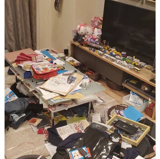 リビングは色々な事をする場所なので、ついついモノをそのまま置きっぱなしにしがちで、散らかります。家族全員がモノを置きっぱなしにすれば、こんな状態に・・・!