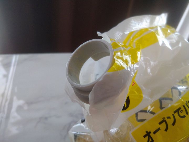 まず、袋の端をカットし、開いた口の内側に一つ目のパーツをセットします。