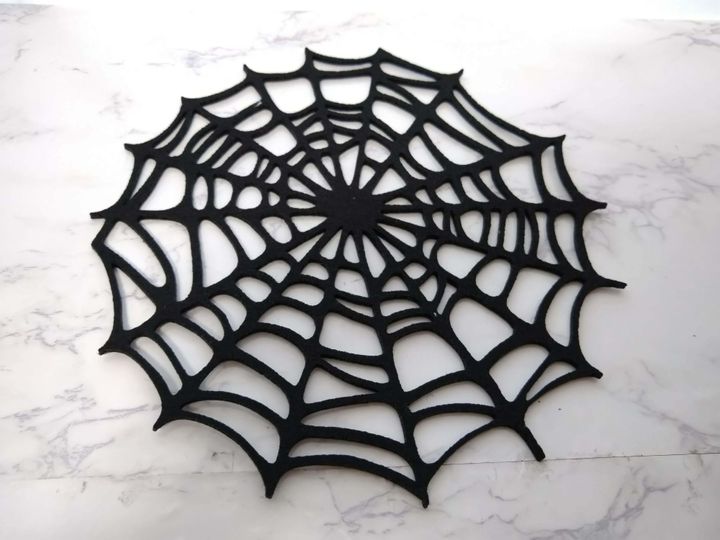 蜘蛛の巣風にカットされたマット。張りがあるので、壁に立てかけても、どこかに吊るしても、ランチョンマットとしてテーブルコーディネート楽しんでもいいですね。