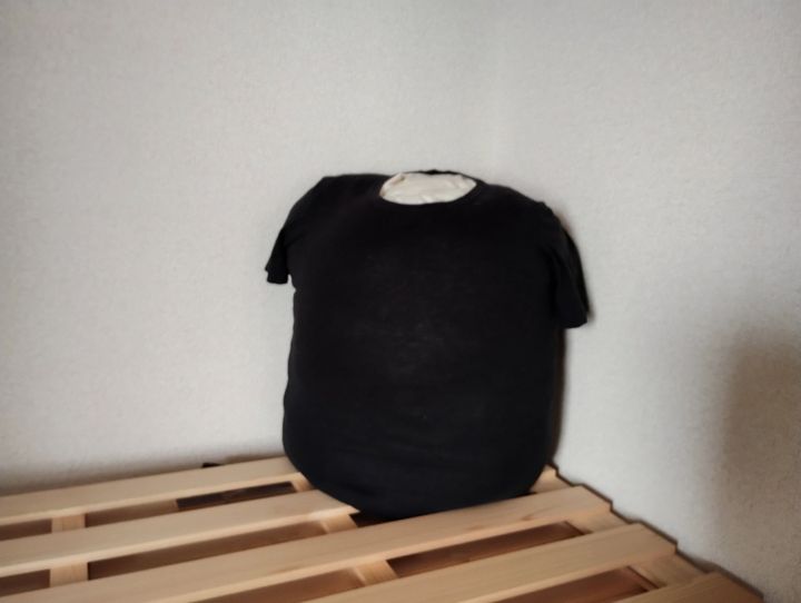 着なくなったTシャツを使って収納する方法です。布団より少し小さめのTシャツを選ぶのがポイント。畳んで詰め込むだけで、しっかり纏まります。袖は内側に折りこみ、襟ぐりはハンカチなどを挟んでホコリ対策をするといいですね。Tシャツなら埃で汚れても洗濯機で洗えます。着なくなった服が再利用できるのも嬉しいですね。
