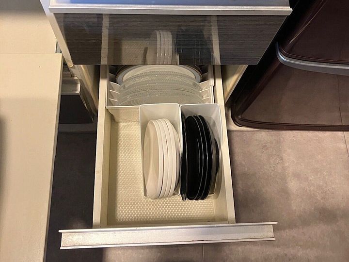 袋入り食品以外にも、お皿や保存容器のフタなどにも使ってみました。お皿は直径15cmです。立てるととりやすくなります。引出しだけでなく、棚のスキマスペース、奥行きがないところでも使えますね。