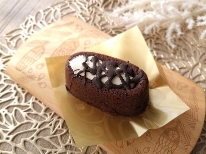 中央にクリームが見えて、チョコレートがトッピングされています。