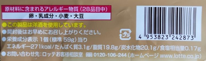 原材料名 乳等を主要原料とする食品(植物油脂、砂糖、水あめ、 クリーム、 その他) (国内製造)、準チョコレート、 液卵、 小麦粉、砂糖、ショートニング、マーガリン 洋酒、植物油脂、 脱脂粉乳、 水あめ、乳清たんぱく 乳化剤(大豆由来)、 加工でん粉、 メタリン酸 Na、香料、膨脹剤、増粘多糖類、 pH調整剤