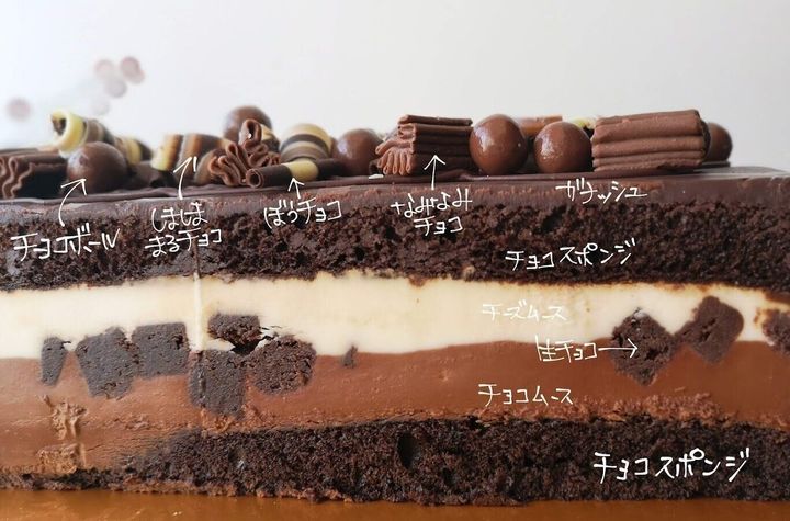 原材料名: ケーキ (乳等を主要原料とする食品、砂糖 チョコレート、 全卵、 小麦粉、 クリームチーズ、 そ の他)、チョコレート、チョコボール、 チョコヘーゼ ルコーチング/加工デンプン、着色料(カラメル、カ ロチン)、炭酸水素Na、膨張剤、糊料(ピロリン酸 Na、アルギン酸Na、増粘多糖類、CMC、セルロ ース)、乳化剤、香料、 アカシア、光沢剤、(一部に 小麦・卵・乳成分・大豆を含む)