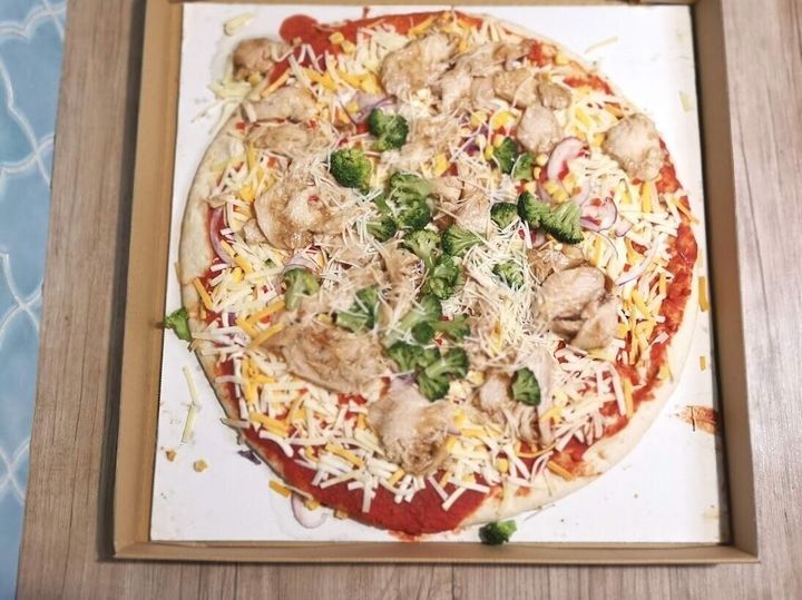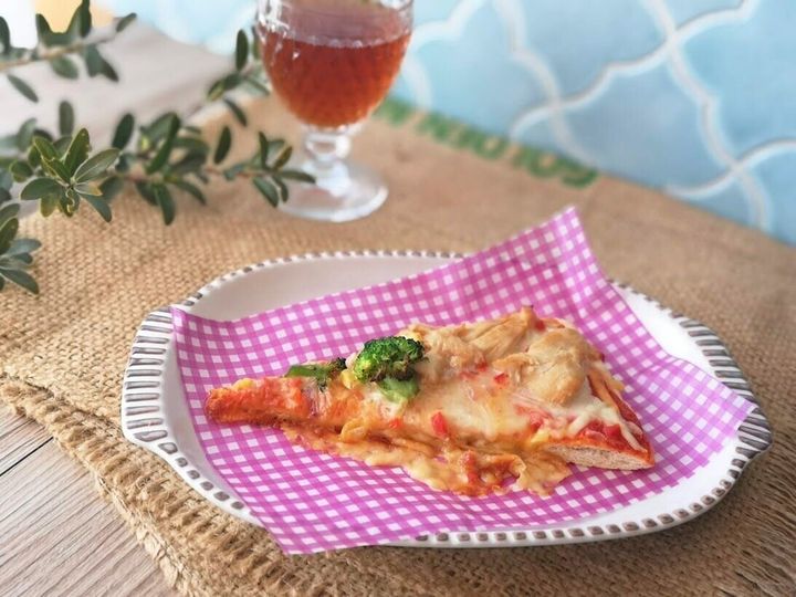 今回のテリヤキチキンピザは、ピザ生地にトマトソースがたっぷり塗られ、チーズ、コーン、チキン、ブロッコリー、赤たまねぎ、パプリカがトッピングされていますよ!