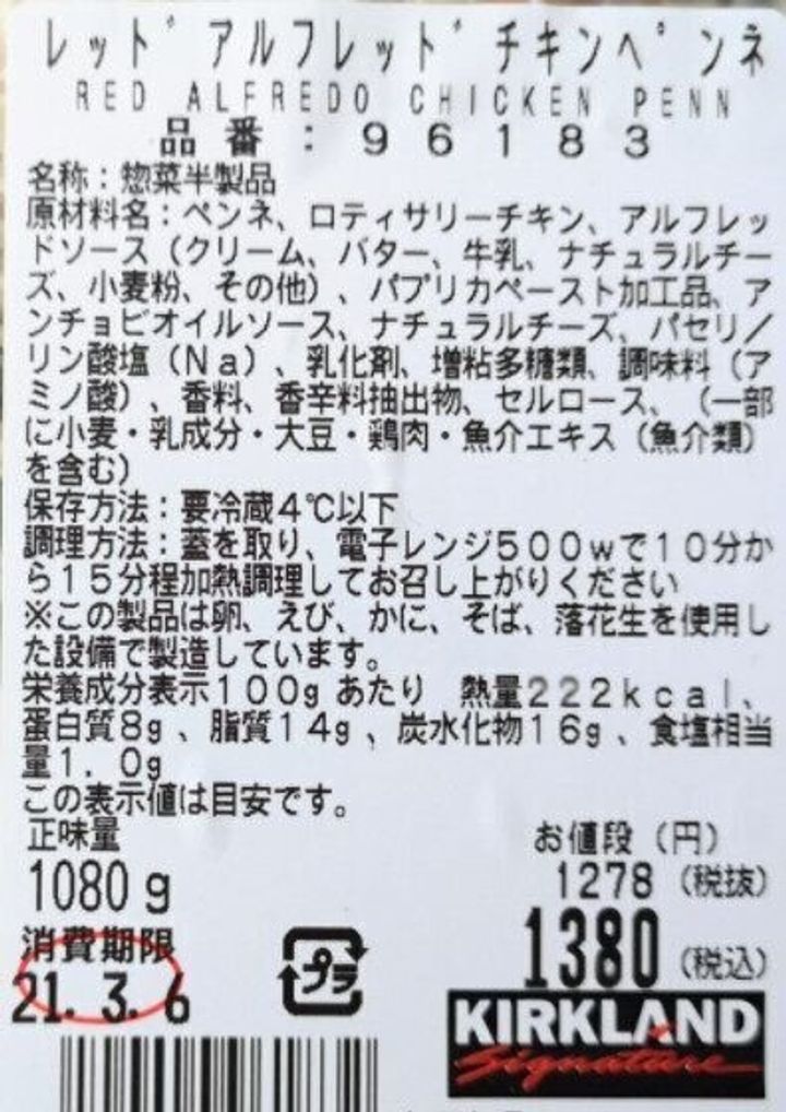 原材料名にペンネの次に『ロティサリーチキン』が確認できます。