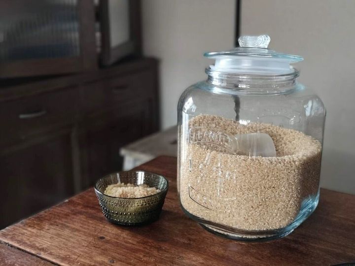 エンボスのデザインのある収納瓶なので単調になりがちなお米も表情をつけて見せる収納が出来ますよ!