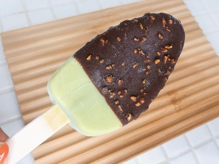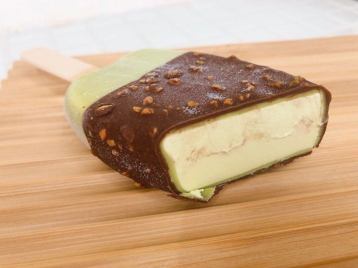 ピスタチオペースト入りのアイスの上にピスタチオチョココーティング、その上に更にクラッシュピスタチオ入りのセミスイートチョココーティングとこれまでにない贅沢すぎる味わいです!