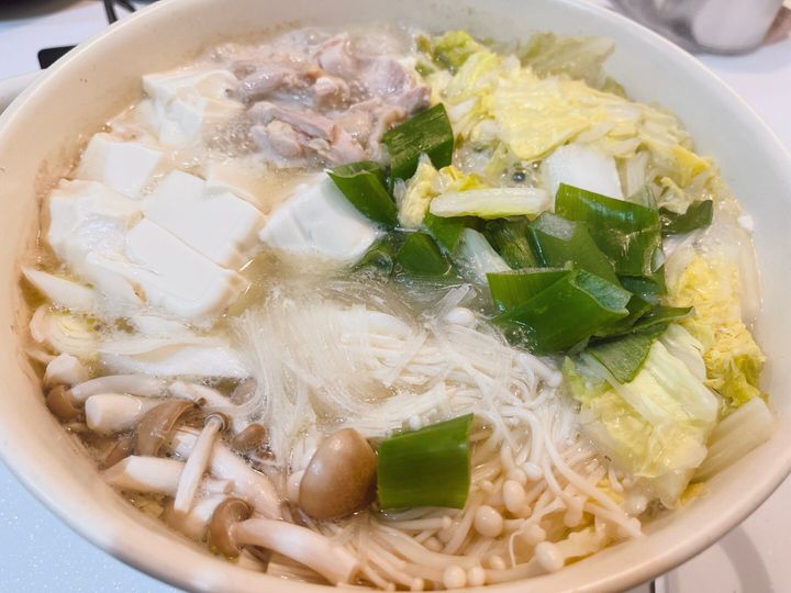 鶏肉、白菜、長ネギ、えのき、しめじ、豆腐、マロニーを投入!