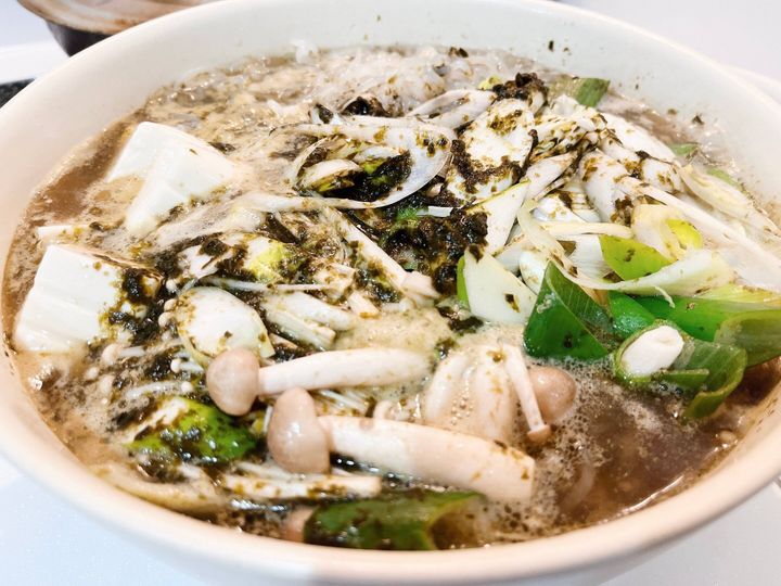 かつお、昆布だしベースのつゆに、有明海産海苔をふんだんに加えたやさしい味わいで、風味豊かな変わり鍋のつゆです。