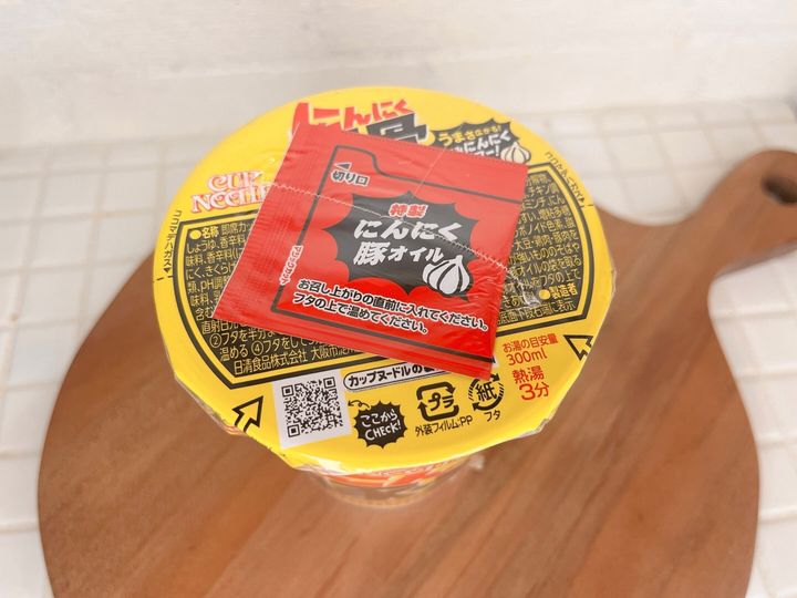 フタの上には、食べる直前に入れるにんにく豚オイルが付属で貼りついています。