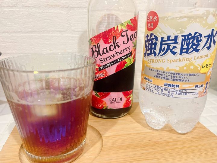 ノーマル炭酸水でももちろん美味しいですが、レモン炭酸水で割るとレモンとストロベリーが合わさって、よりフルーティで爽やかなティーソーダが楽しめます。甘いのが苦手な方にもオススメですよ!