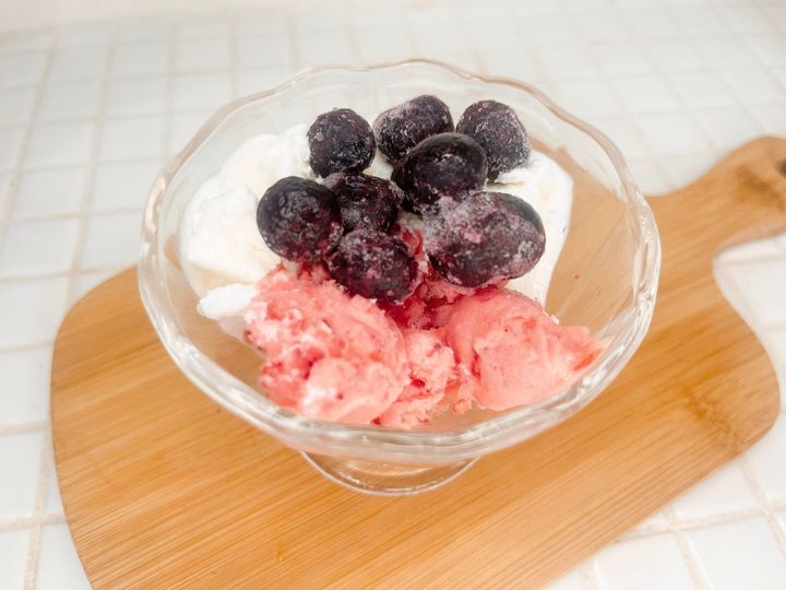 苺をのせて食べたかったのですが苺がなかったので、家にあった冷凍のブルーベリーをのせて、ベリーアイスにアレンジしてみました。