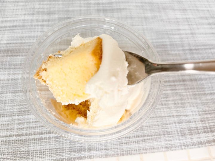 フォークでシフォンケーキをすくってみましたが、柔らかくてふわっふわでビックリしました!そのまま口に入れると、ふわふわシフォンとなめらかなホイップクリームが合わさって絶妙なバランスでとっても美味しいです。