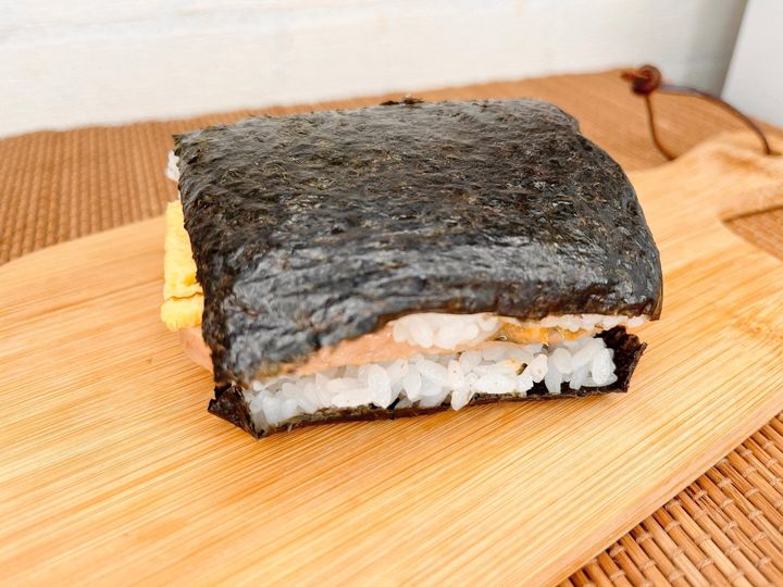 海苔、ご飯部分から定番のスパムと玉子焼きがはみ出しています。