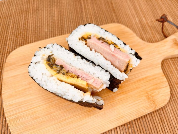 高菜明太と定番のスパム&玉子が相性抜群でとっても美味しいです。