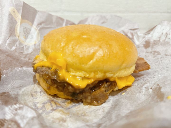 ふわっふわでバター風味のバンズ、しっかりしたスモークベーコン、濃厚なトマトクリームソース、ぷるんぷるんのたまご、ビーフパティ、とろーりチェダーチーズ、そして甘辛なすき焼きフィリングがたっぷり入っています。
