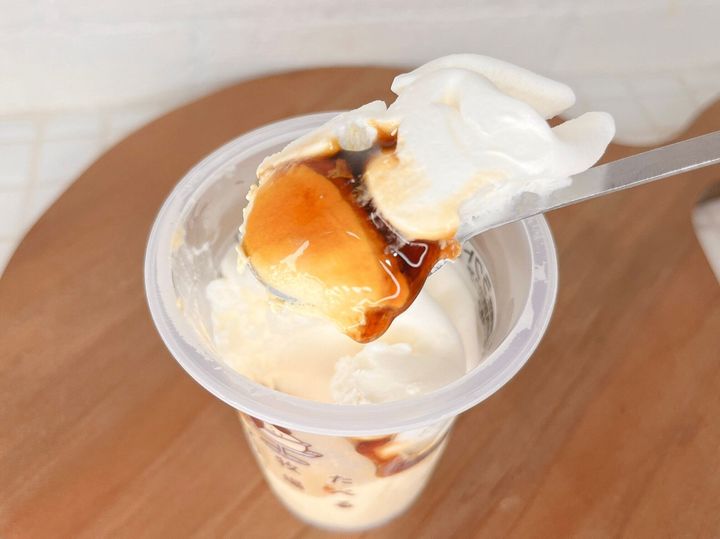 ミルクアイスの下にはアクセントになるほろ苦いカラメルソースが入っていて、一番下はたまごのコク、うまみが感じられる濃厚なプリンアイスになっています。