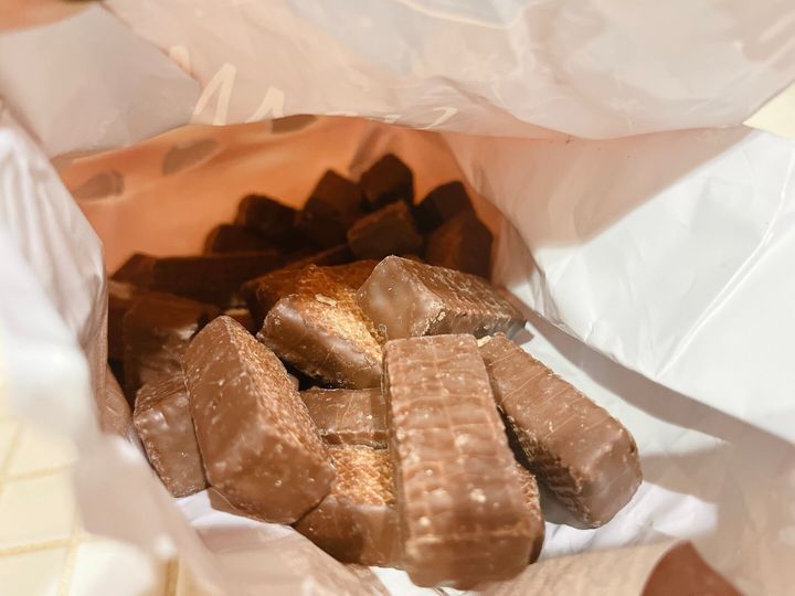 一口サイズのサクサクのウエハースにチョコレートでコーティングされている商品です。