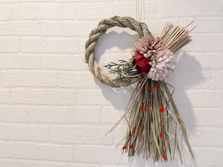 くすみピンクの花とお正月っぽい赤い花と飾りが素敵です。