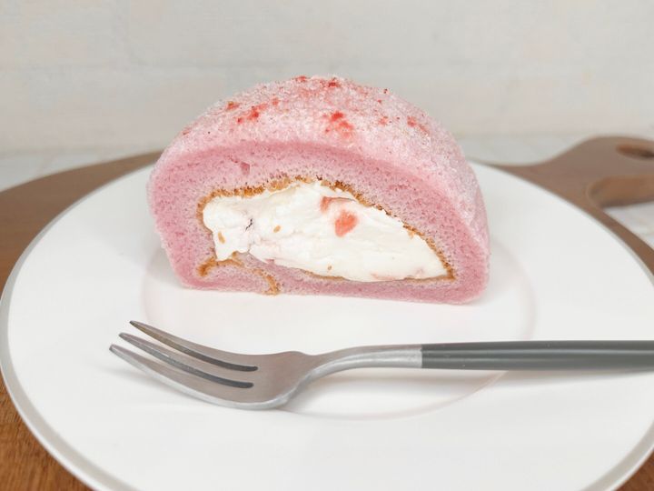 いちごパウダーがかかっていて見た目の彩も綺麗なローソン新作『もち食感ロール(いちご&ミルク)』