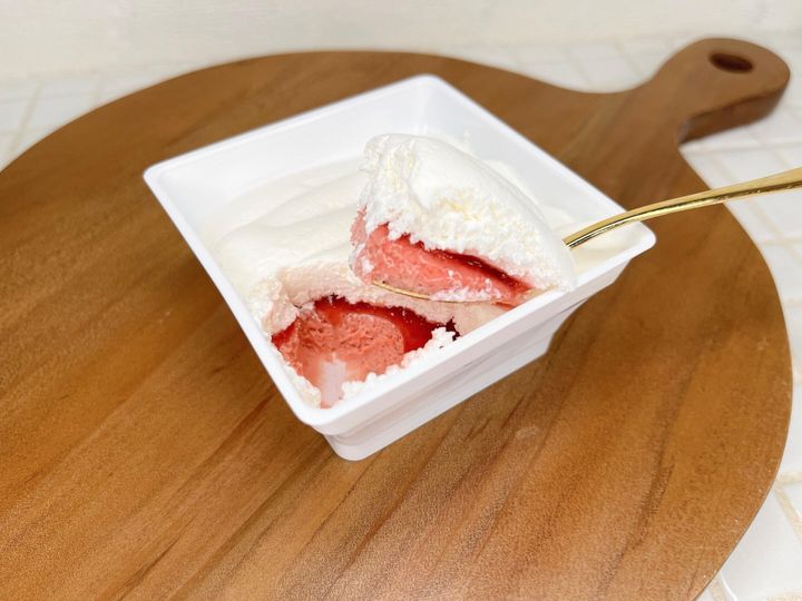スプーンですくってみると、ホイップ、いちごソース、いちごチーズケーキが綺麗に3層になっています。