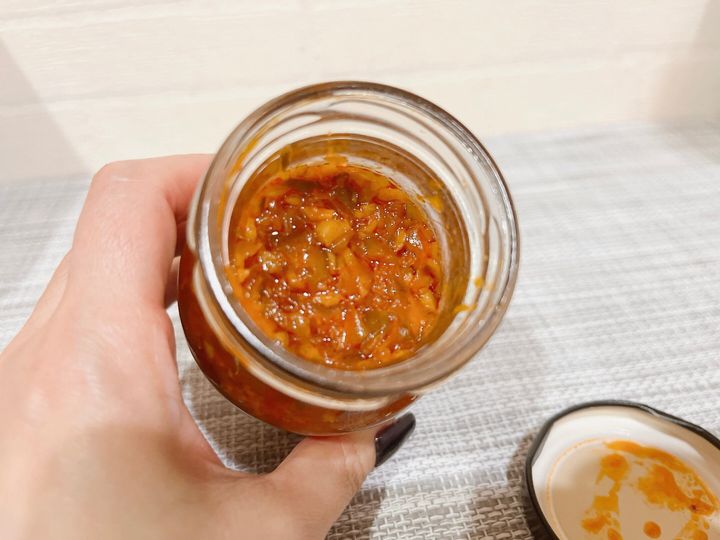 フタを開けると、にんにくと醤油、辛さが混ざった様な結構パンチのある香りがします。