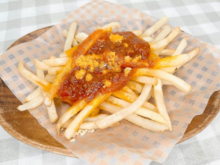 通常の作り方でポテトを揚げ、塩を少々振り、その上にミートソースやボロネーゼソースをかけるだけでおつまみにも最高なアレンジポテトの出来上がり!