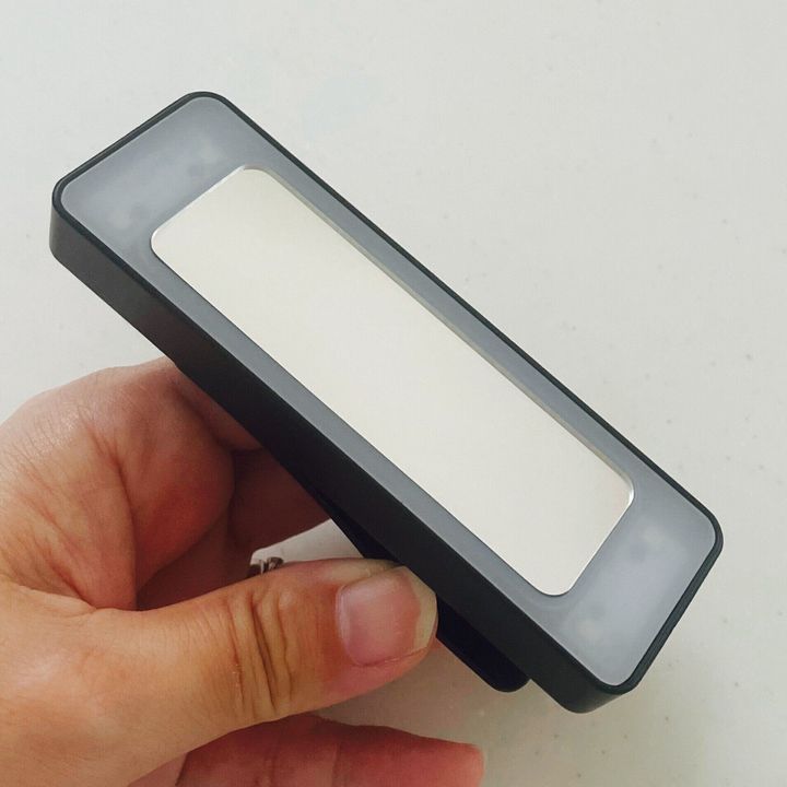 ボタン電池をセットしてネジをしっかりしめた後、ミラーのないメイクパレットの蓋部分にクリップを使って商品を挟み本体のサイドにあるスライドスイッチをONにすると...