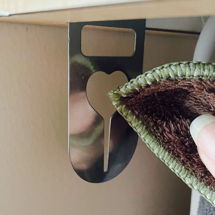 わが家はマイクロファイバーのハンドタオルを台拭きにしているので、タオルホルダーに差し込む際は角部分を差し込みます。