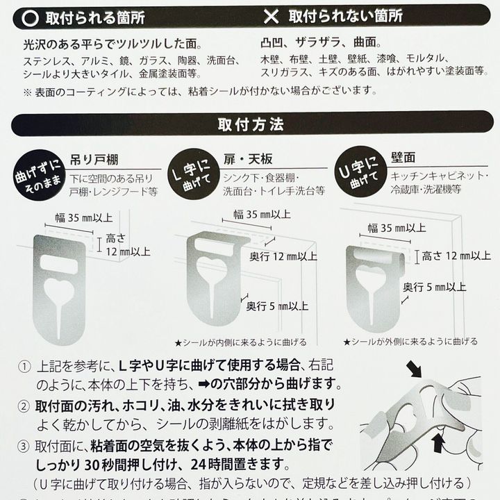L字に曲げて扉や天板・U字に曲げて壁面などに設置できます。