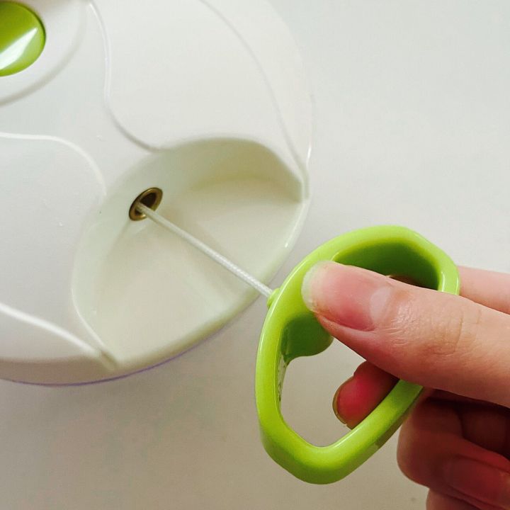 ハンドルには紐がつながっていて、ハンドルを引くことで中の刃が付いた支柱が回転し野菜をみじん切りにしてくれます。