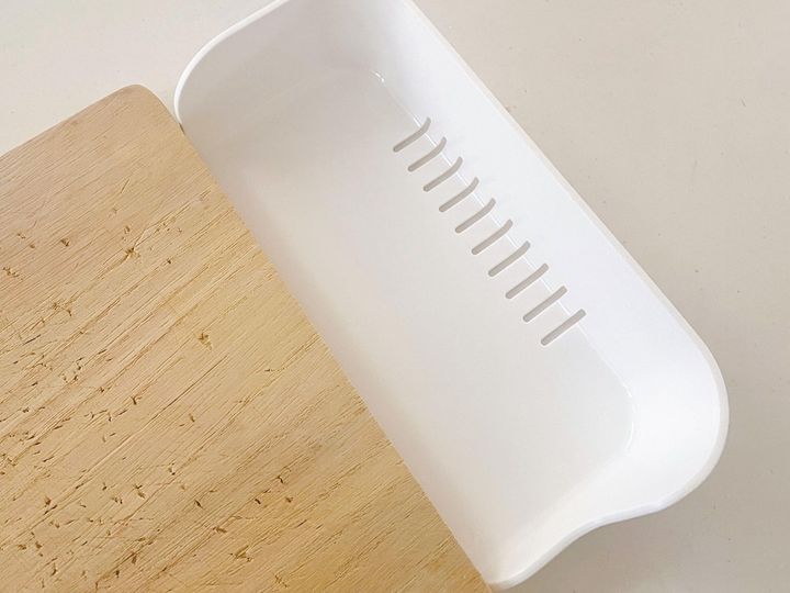 実はこのボウル、高さのない部分をまな板の下に差し込んで使うんですよ。こんな使い方をするボウルって今までなかったですよね。
