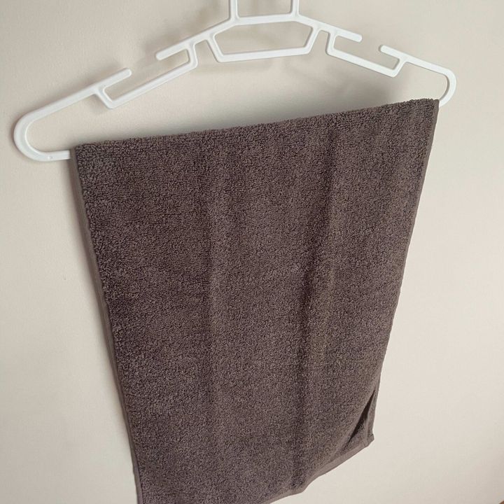 買い替えたバスタオルはこのように洋服ハンガーにラクラク干せて、面積が半分なので乾くのも早いというメリットも。