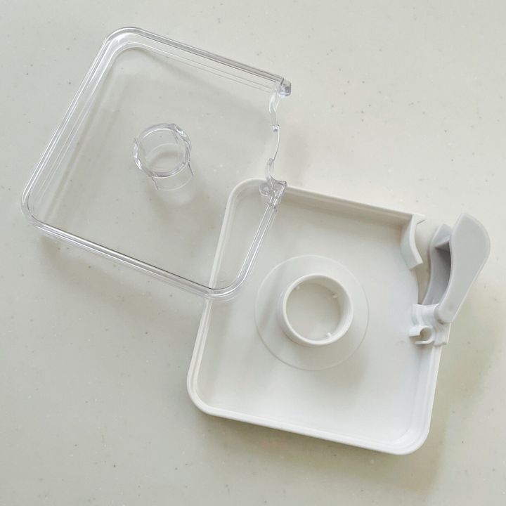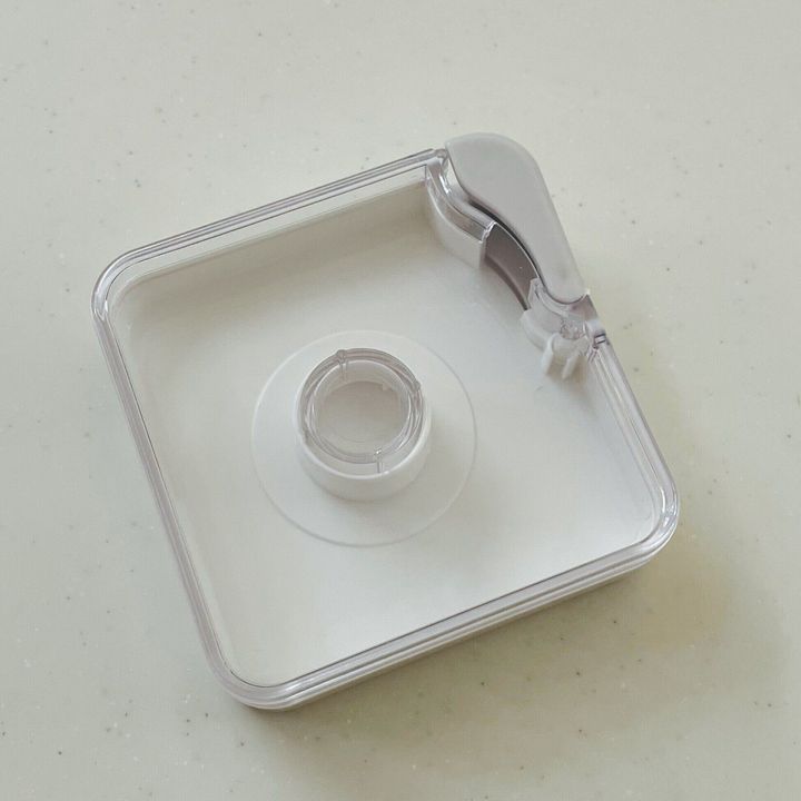 グレーの部分はテープを切るカッター部分で、使わないときはこのように閉じることで怪我をする心配もなくスクエア型をキープできますよ。